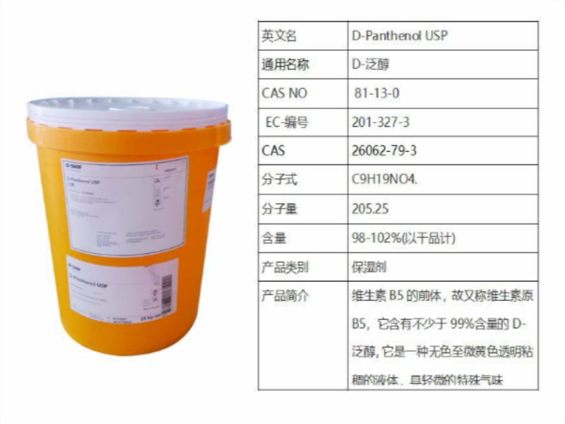 产品简介:D-泛醇(Dexpanthenol) D-泛醇(99%)是维生素B5的前体,故又称维生素原B5,它含有不少于99%含量的D-泛醇,它是一种无色至微黄色透明粘稠的液体,具轻微的特殊气味